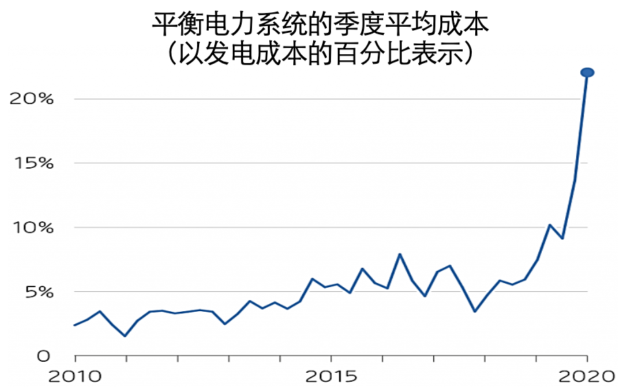 以英国的经验为例,2010年以前英国平衡电力系统的成本一般占整个发电成本的5%以内,而随着近年来英国能源结构中新能源占比的提高,平衡成本在2020年升到了发电成本的20%左右。